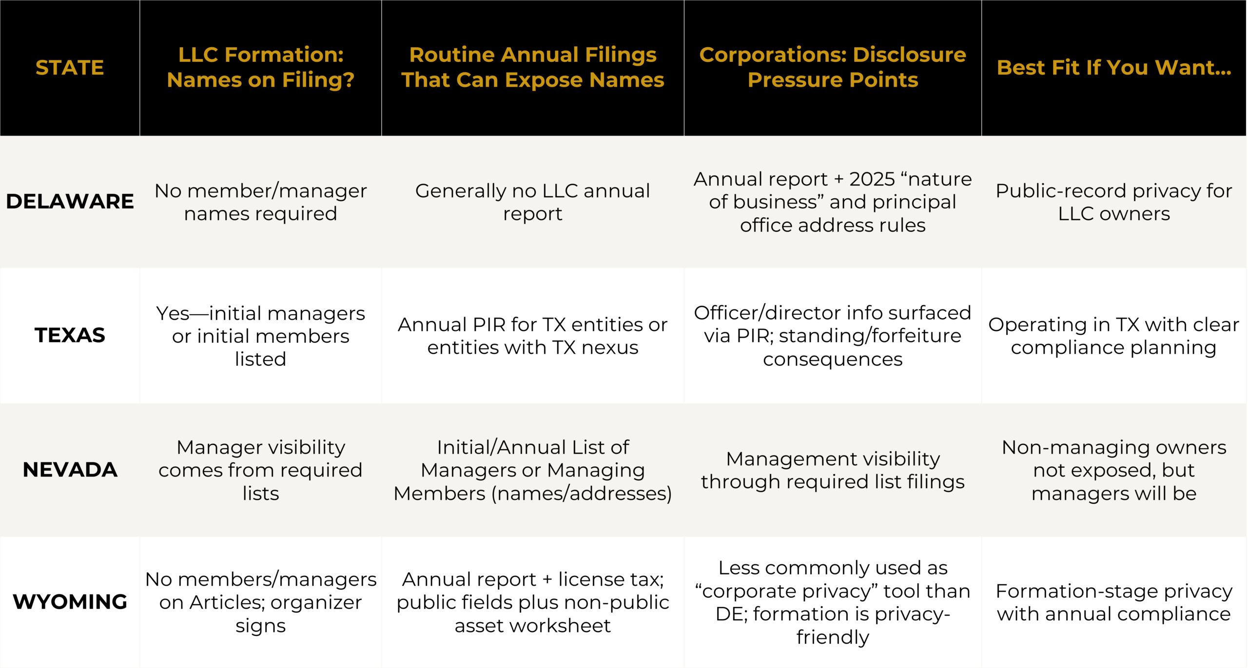 Regardless of state choice, anonymity is never absolute. Banks, counterparties, regulators, and courts can still require ownership and control disclosure depending on the situation.